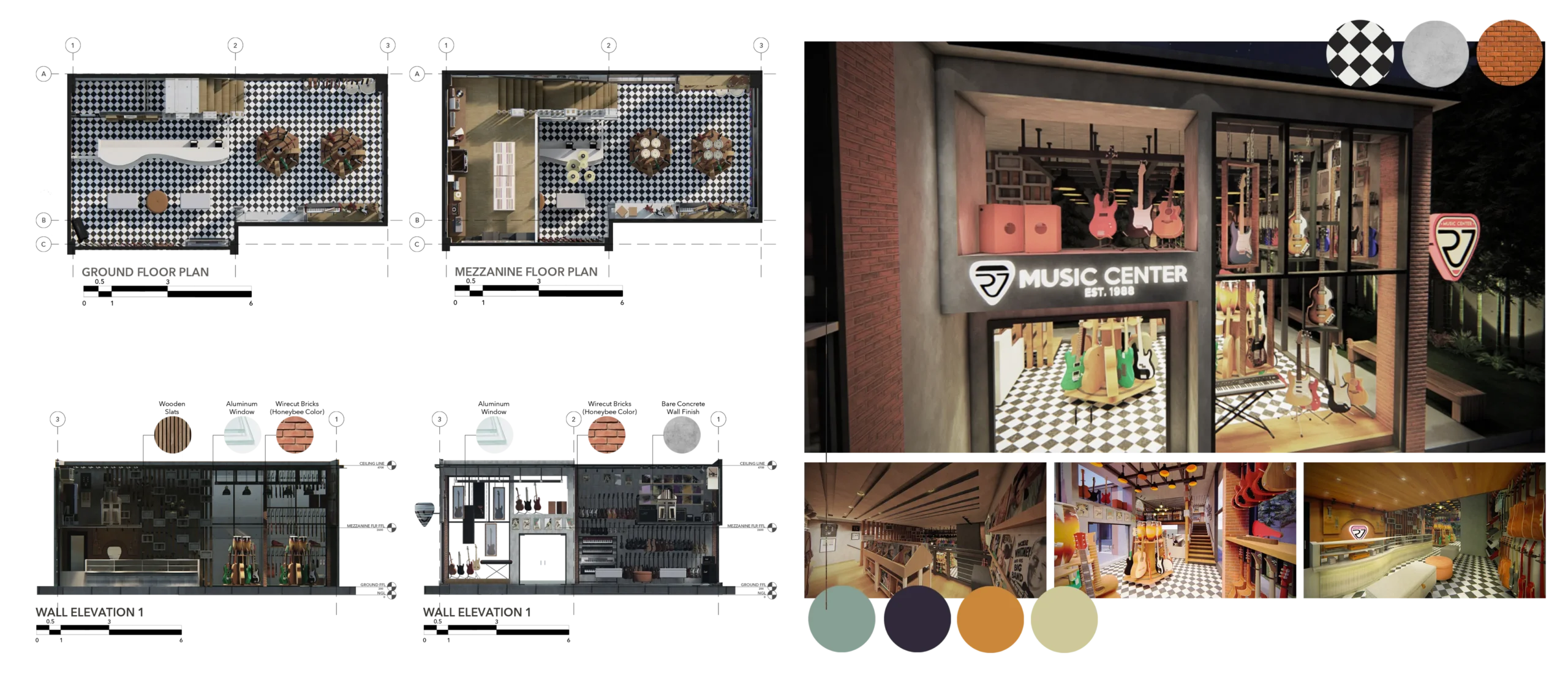 A Vintage Classic concept aims to create a retail space that will provide quality craftsmanship of records and instruments so that it will establish an outstanding and timeless value to its customers. This was exhibited through a Retro Industrial design style where the plan followed an open layout, structural elements were exposed, and metal and wood materials were widely used.