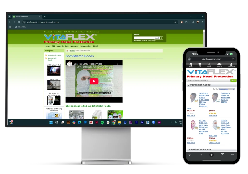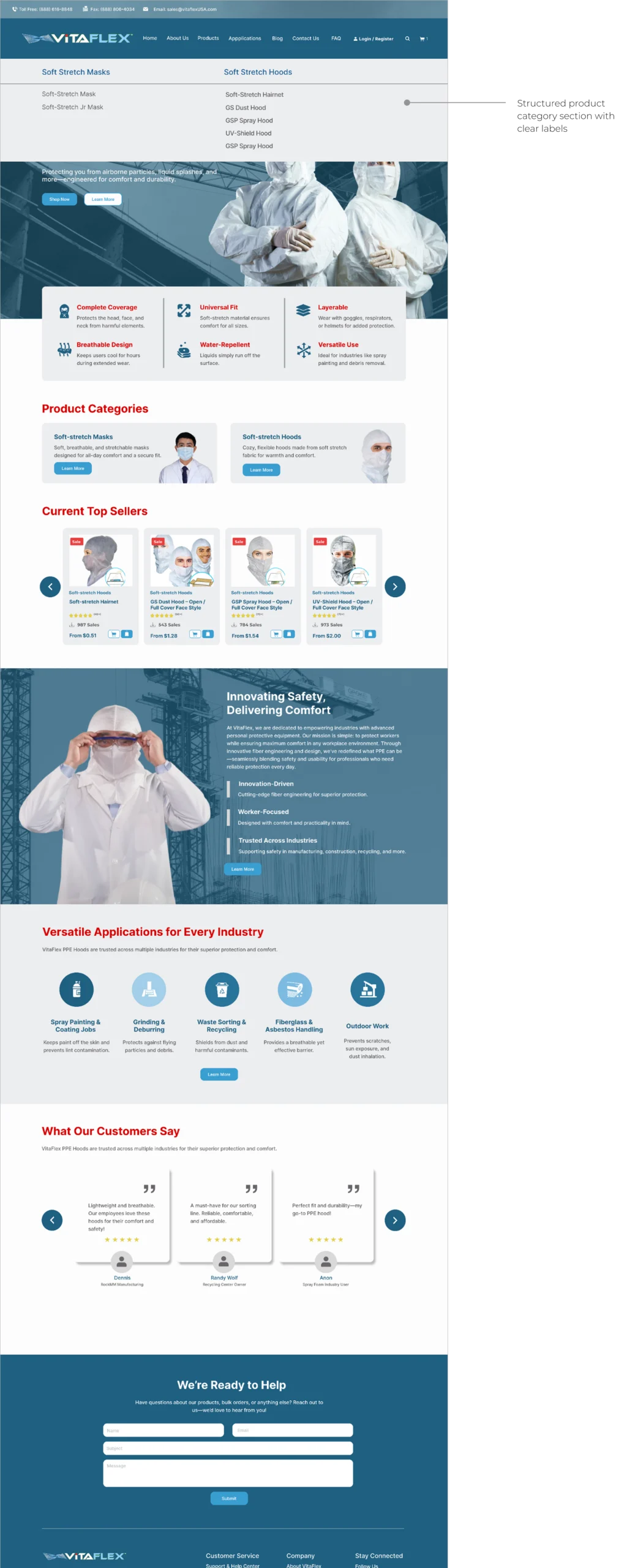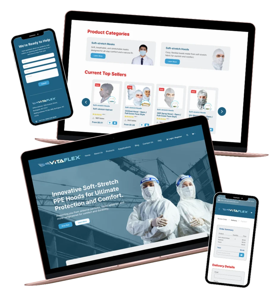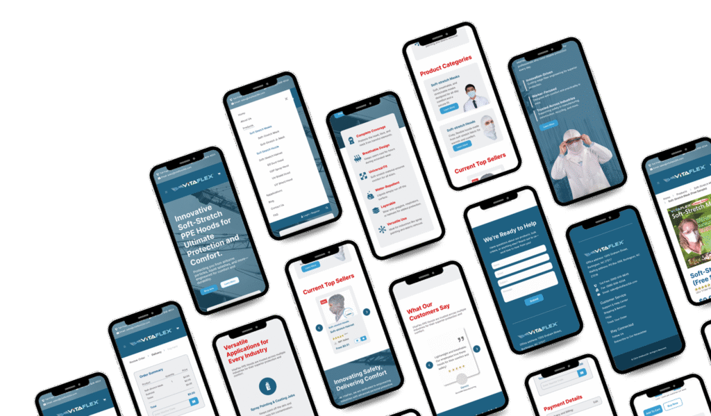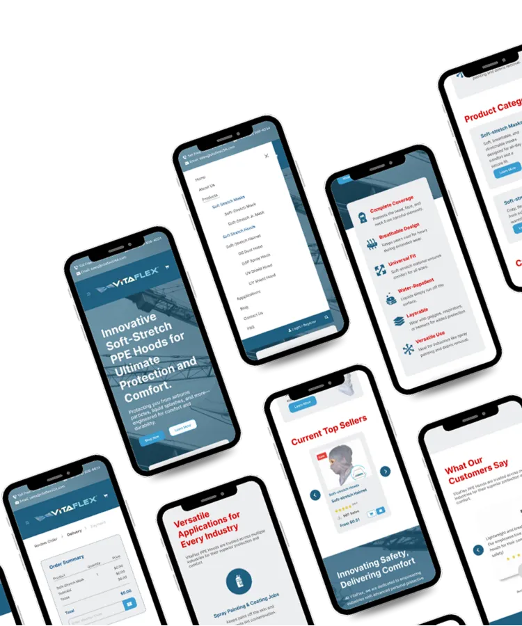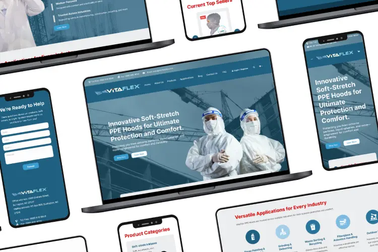 VitaFlex is a specialty material company offering innovative soft-stretch PPE hoods for ultimate protection and comfort. Their previous website was outdated, difficult to navigate, and did not effectively showcase their products and company values. My goal was to create a modern, user-friendly website that enhances the user experience and aligns with VitaFlex’s brand identity.