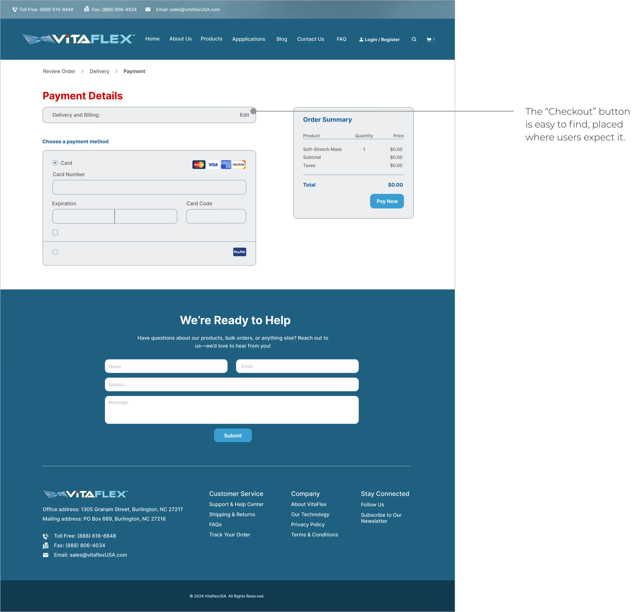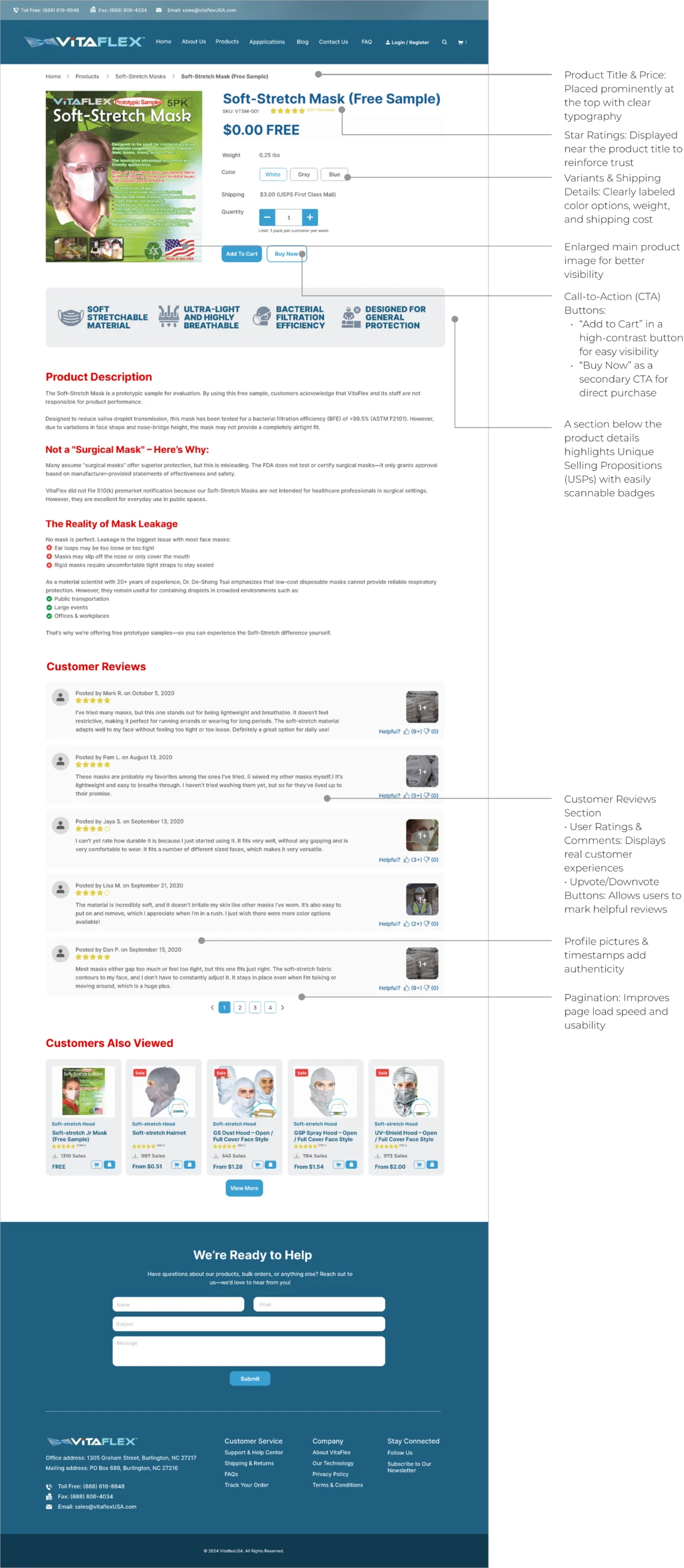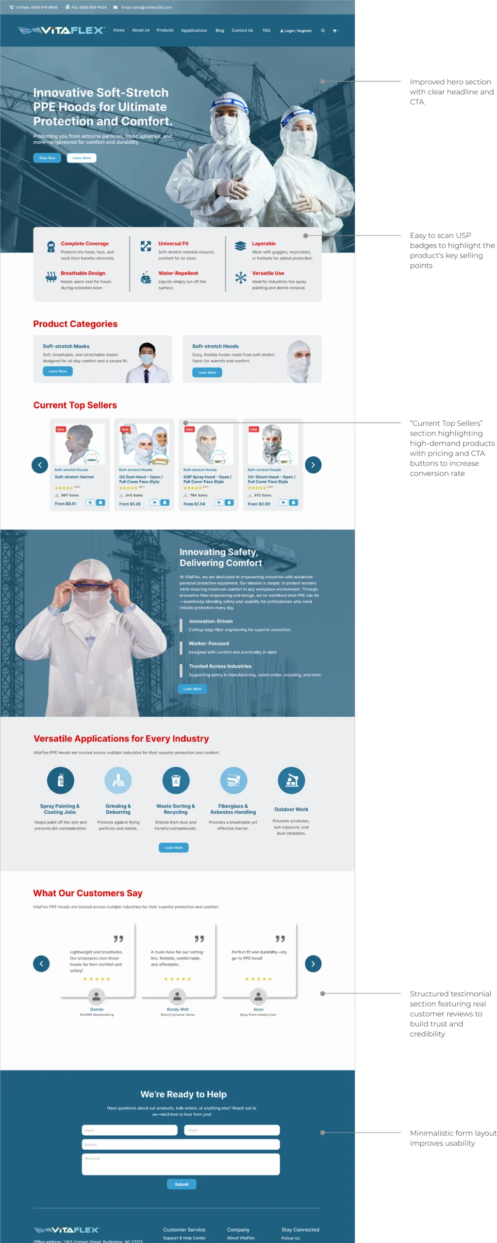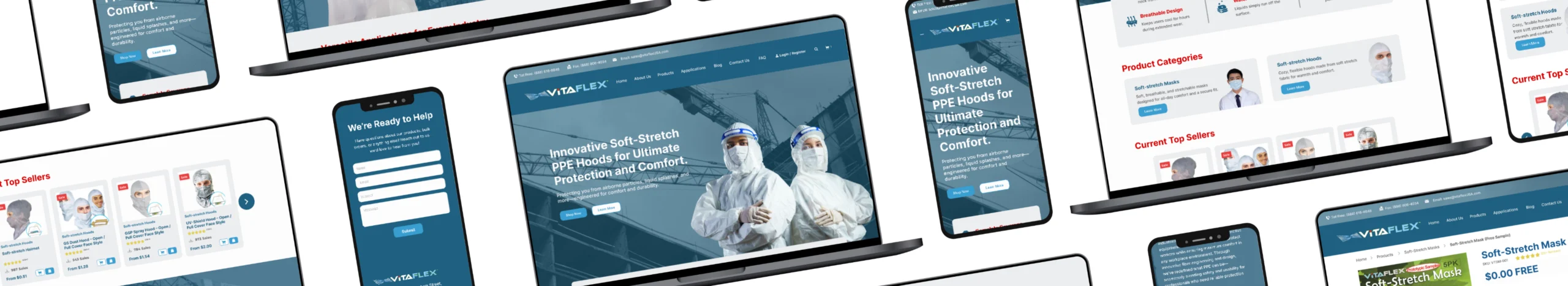 VitaFlex is a specialty material company offering innovative soft-stretch PPE hoods for ultimate protection and comfort. Their previous website was outdated, difficult to navigate, and did not effectively showcase their products and company values. My goal was to create a modern, user-friendly website that enhances the user experience and aligns with VitaFlex’s brand identity.